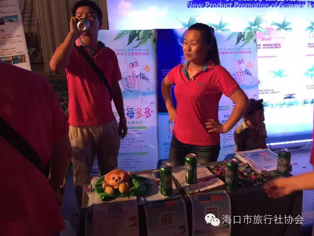 来源: 发布日期:2015-07-07 浏览次数:7月6日晚在海口市旅游发展委员会的大力支持下,由海口市旅行社协会举办的2015海口旅行社暑期旅游新产品“送爽”活动在复兴城中国香街举行,据签到统计参会的海口旅行社数量达100家、参会人数达800人左右。与此同时海口市旅行社协会特邀请了赞助商青岛啤酒,免费为广大市民提供,参会人员尽可开怀畅饮,让这个夏季清爽彻底。该活动的主持人是由海口市旅行社协会秘书长麦伟文担任。